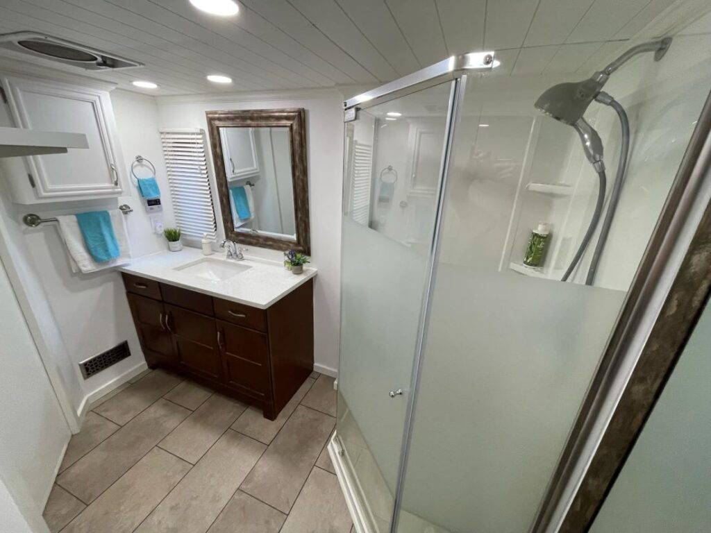 Other Features: Quiet and peaceful lot, with a beautiful green space view in front. Power, Water, Sewer. The trailer is cmpletely renovated, with Ikea cabinets and quartz countertops in the bathroom and kitchen. Built in custom pantry with sliding drawers. New park model furnace and Rheem tankless water heater. Fire pit in the back with a concrete pad. Retainng wall on both sides of the site. Short walk to the playground, tennis & basketball courts, pool or the Clubhouse.