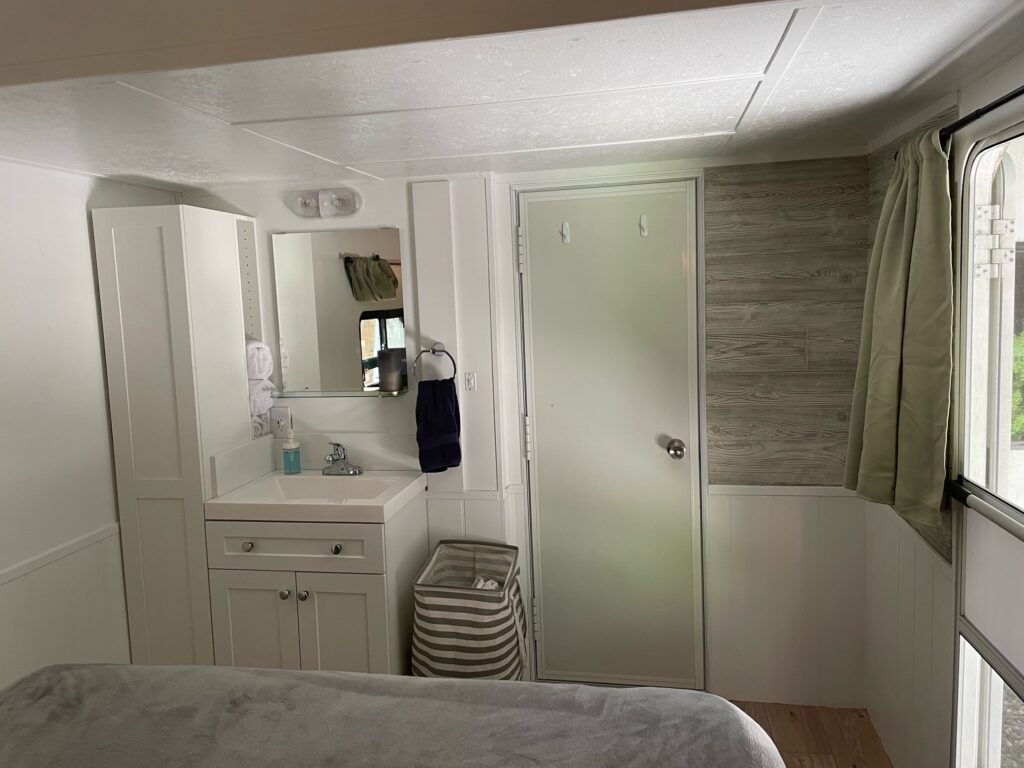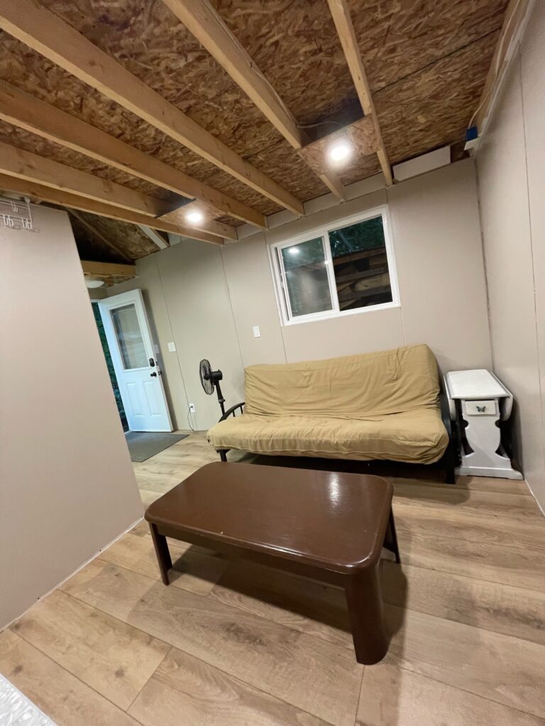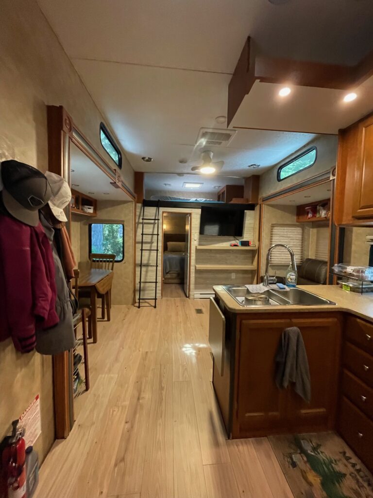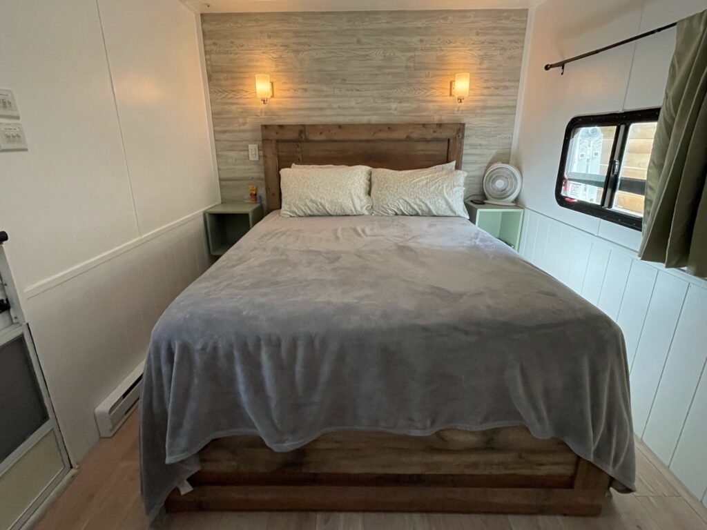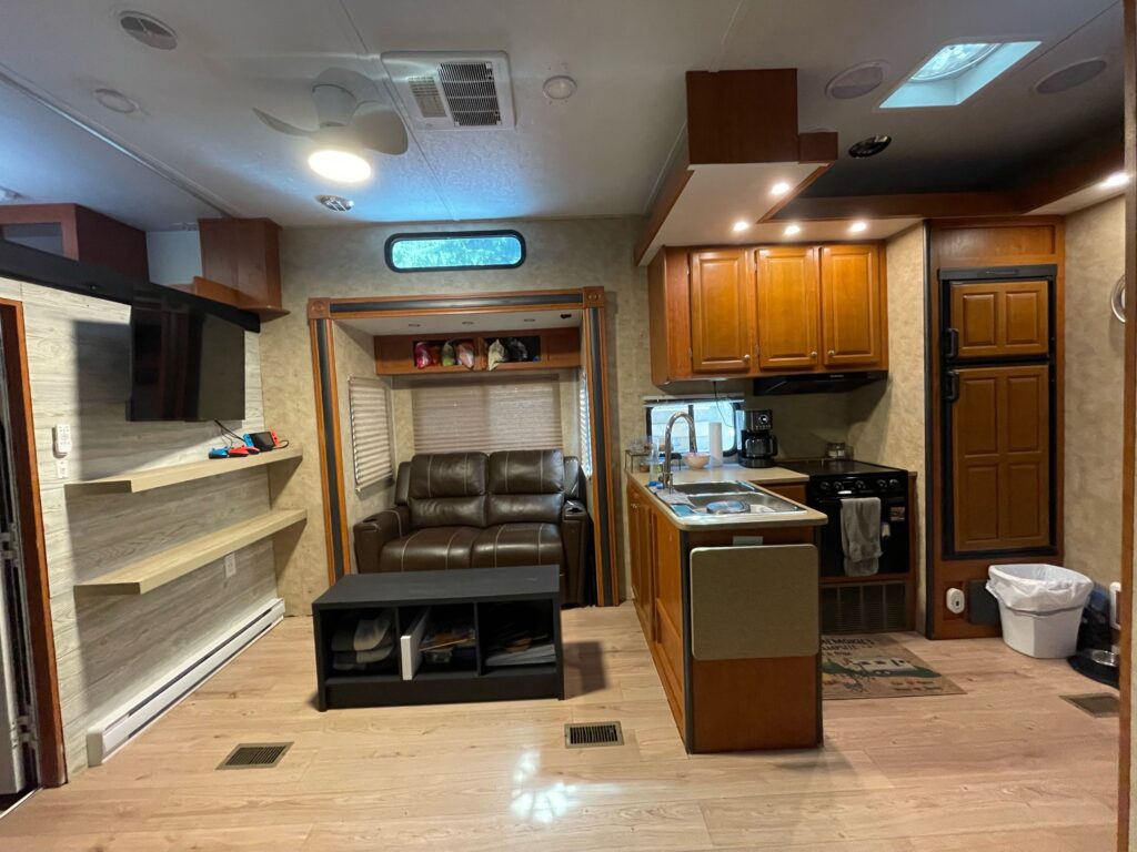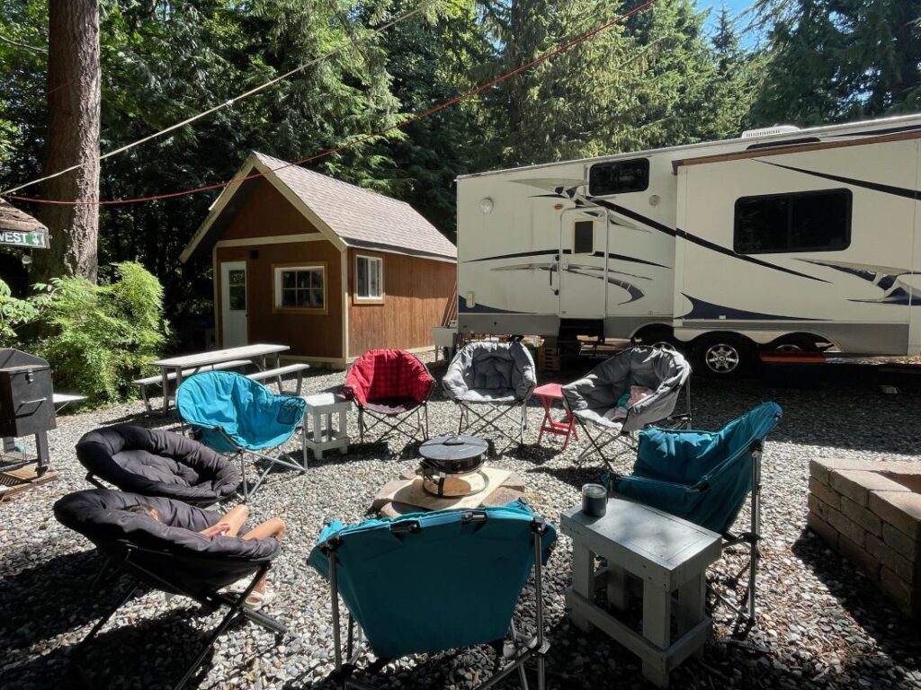39-foot Forest River Toy hauler located on green space that has been remodeled. Includes a queen size bedroom at the front of the trailer, queen size bedroom in the rear of the trailer and a queen size loft in the middle of the trailer (no mattress in loft). Residential style bathroom includes new vanity, flush toilet and a 32 x 36 shower. Vinyl plank flooring throughout the whole trailer, 240v baseboard heating, and a full-size sink in the kitchen. Newly built insulated 12×16 shed with a 12×8 storage loft, futon, storage cabinetry, TV, pantry, full size fridge and plumbing for a bar sink. Installed tankless hot water last year. Outside is a laundry tub size with hot and cold water for washing large dishes and a tarp covers nearly the entire site to keep you dry during the colder months. Includes golf cart and 1 year old BBQ.